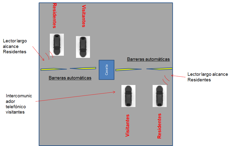 Barreras automáticas Lector de largo alcance hasta 12 metros Intercomunicador telefónico para visitantes Botones en caseta para apertura y cierre manual de barreras Panel de control de acceso Tarjetas de acceso vehicular de largo alcance